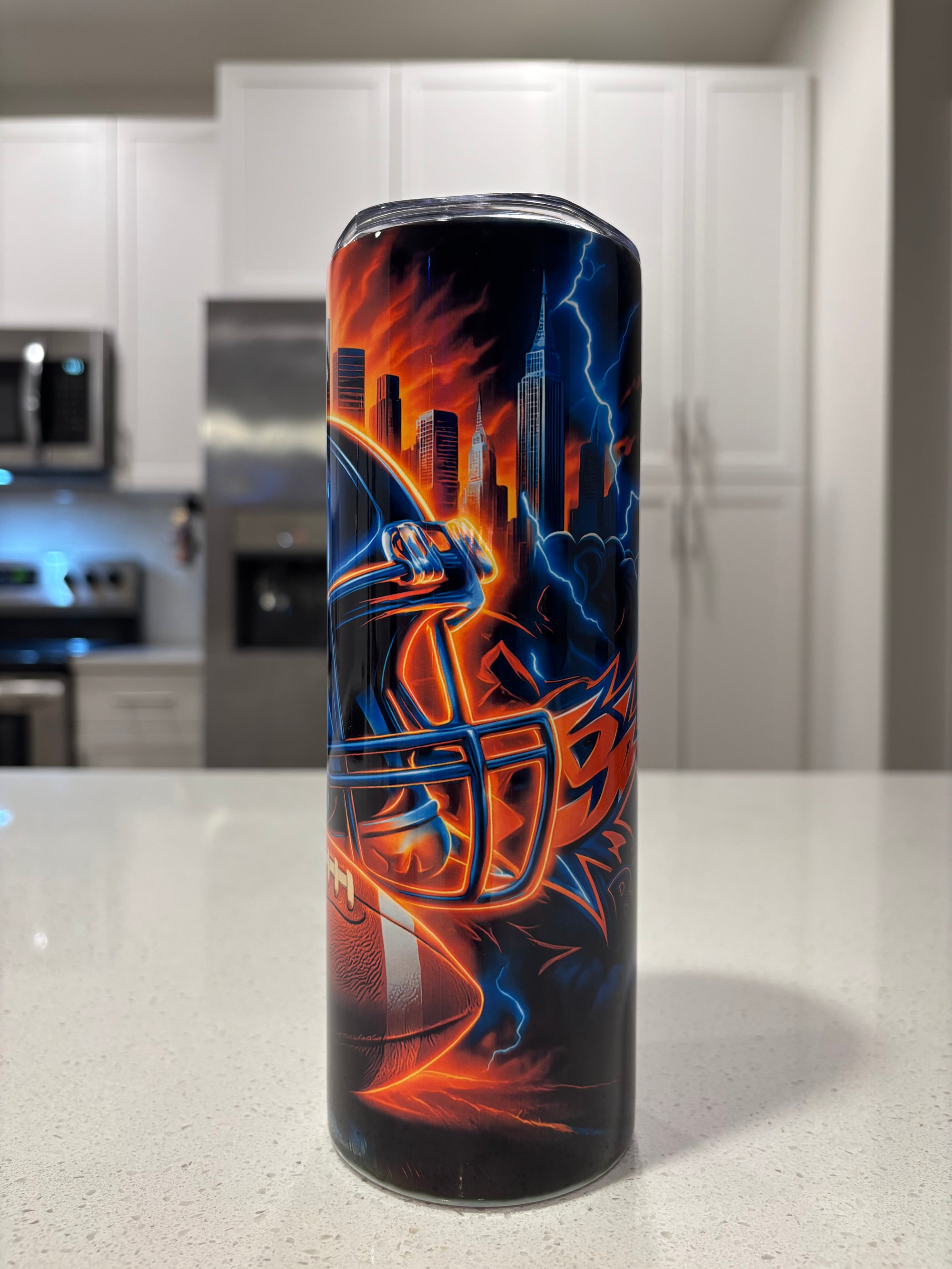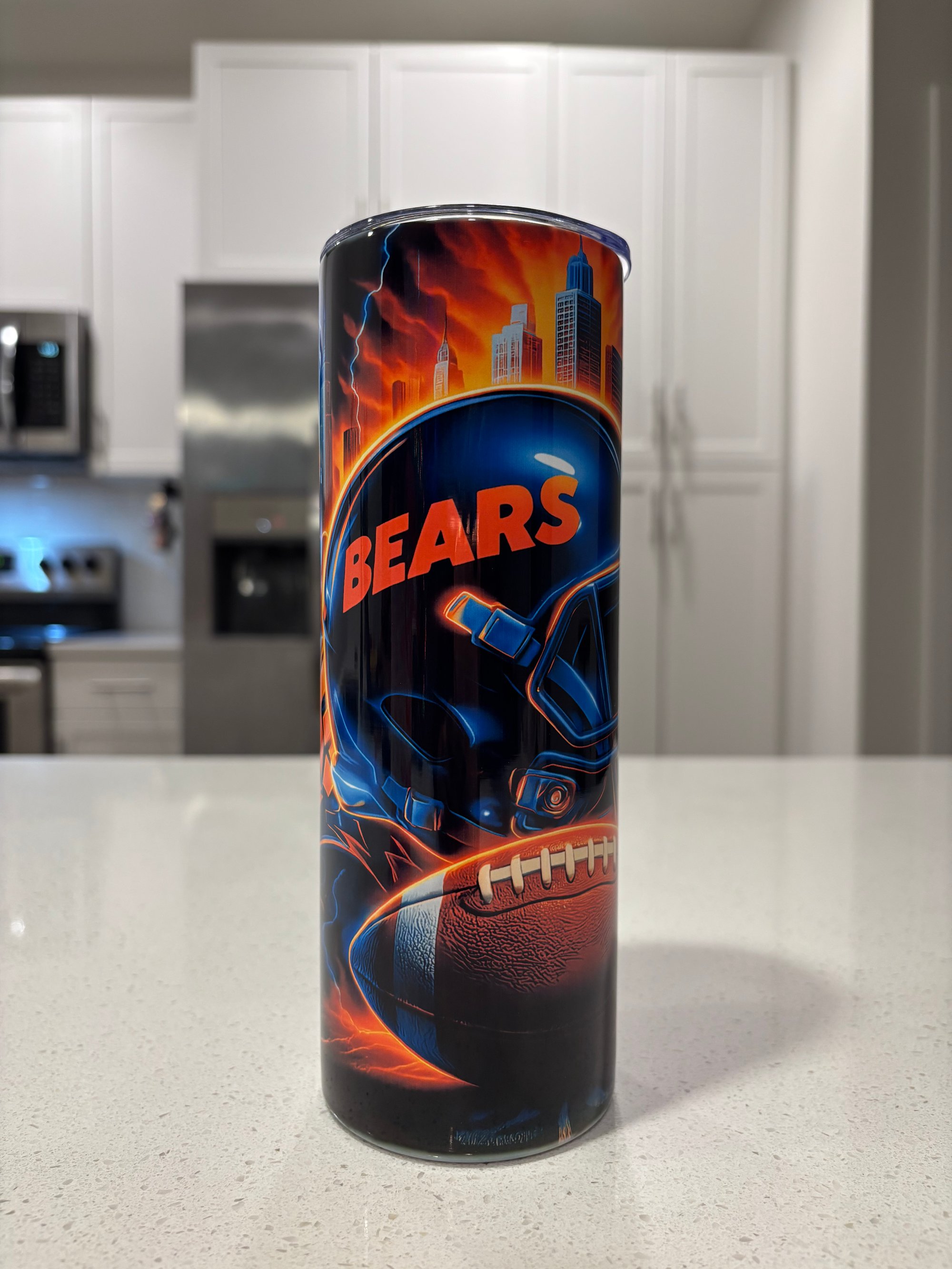 Show off your team pride with this bold Chicago football–inspired 20 oz tumbler. Featuring a striking wraparound design with intense city skyline details, lightning effects, and football graphics, this tumbler is perfect for game days, tailgates, or everyday use.