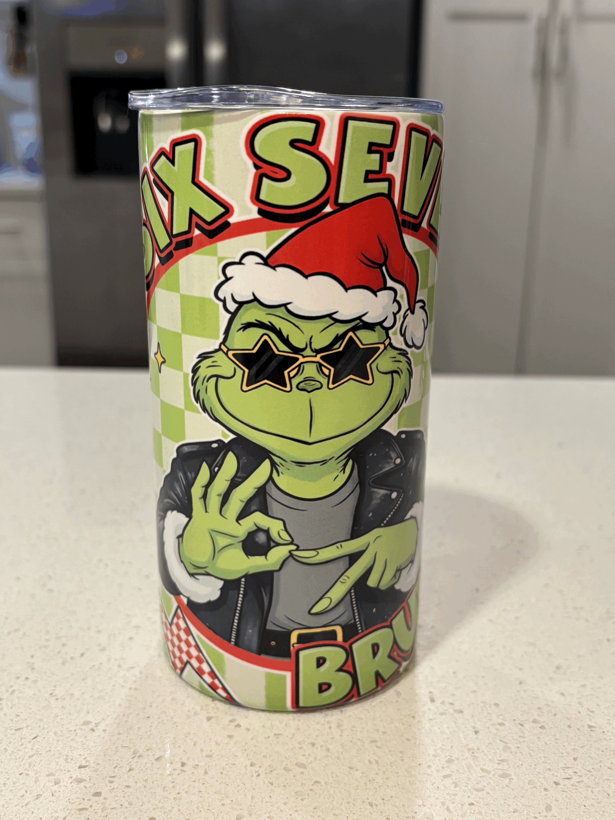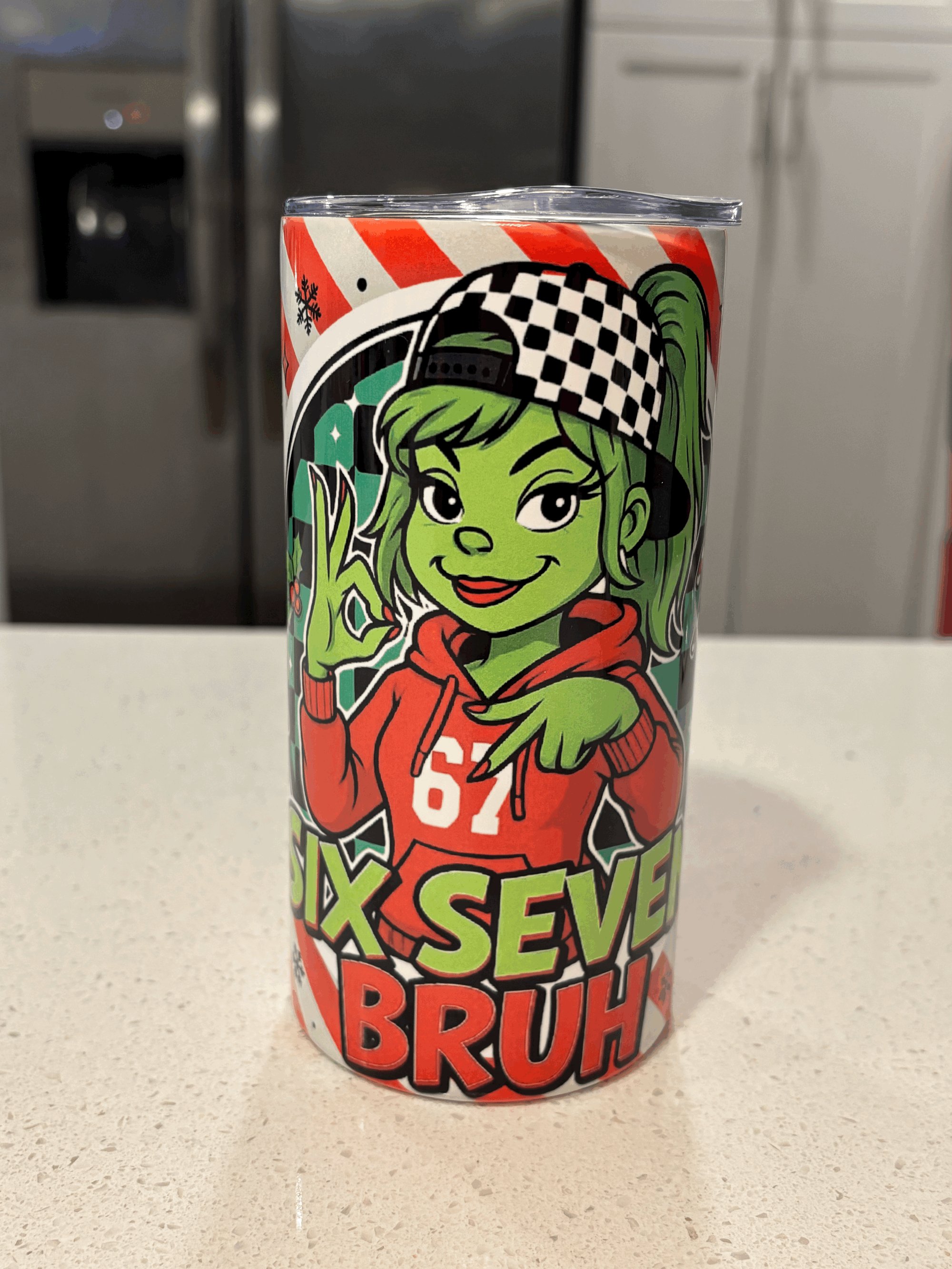 Add some festive attitude to your drinkware with our Grinch “Six Seven Bruh” tumbler. Featuring bold, colorful Grinch-inspired artwork, this tumbler is perfect for kids, teens, and anyone who loves fun holiday designs.